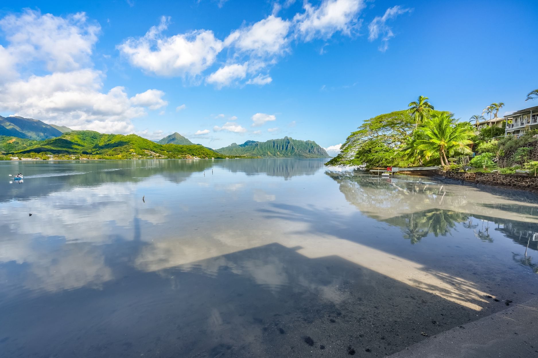 This upscale free standing cottage provides a master bedroom with one King-size pillow-top bed with premium bedding. It features paranomic views of Kaneohe Bay and the ocean and is furnished with a large private waterfront lanai patio.